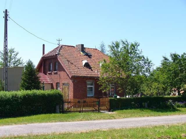 Budynek dróżnika znajdujący się obok dawnego przejazdu, w którym nadal tkwią szyny.