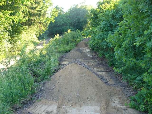 Dawny przejazd kolejowy w okolicy miejscowości Czarne Górne. Jak widać samochody nie dały rady rozjeździć dawnego nasypu, dzięki temu doskonale widać linie starotorza.