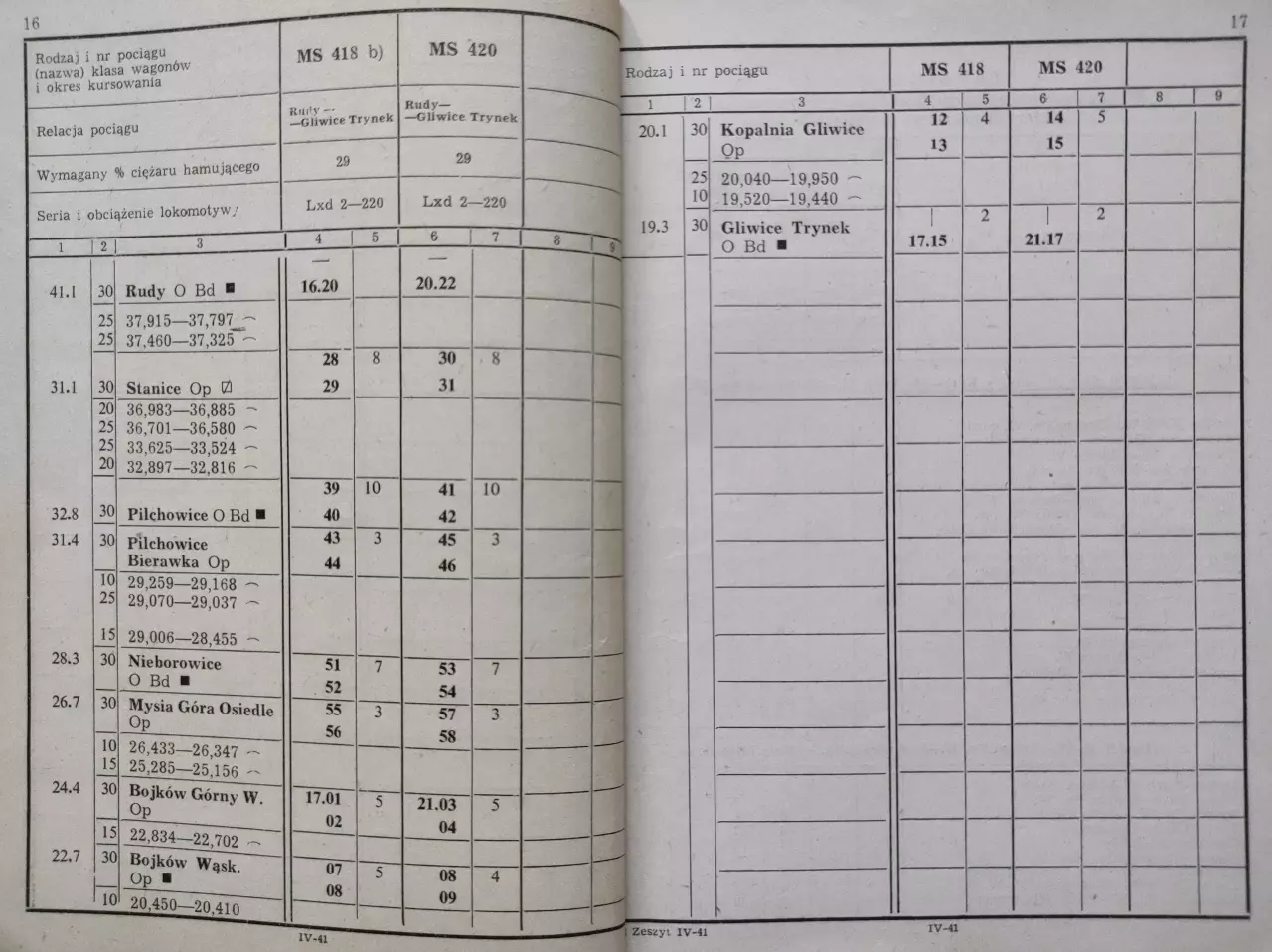 Pociąg pasażerski na odcinku Gliwice Trynek - Rudy, skan ze Służbowego Rozkładu Jazdy Pociągów Pasażerskich i Towarowych - zeszyt IV-41, strony 12-13 (RJ 1985/1986).