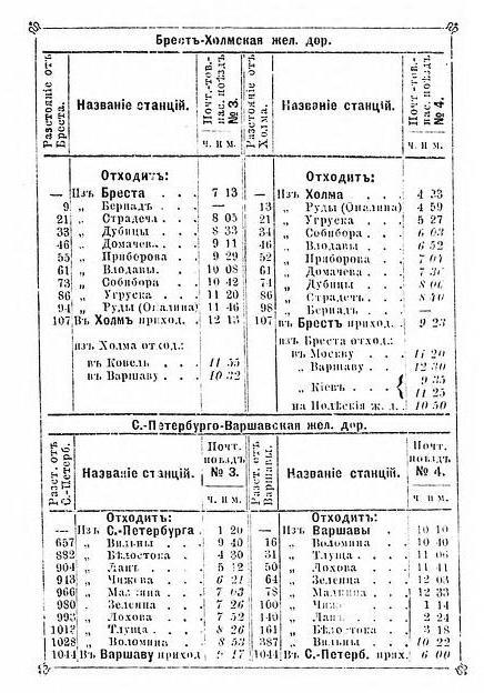Rosyjskojęzyczny rozkład jazdy pociągów z czasów carskich linii Chełm - Uhrusk - Włodawa - Brześć oraz linii warszawsko - petersburskiej.