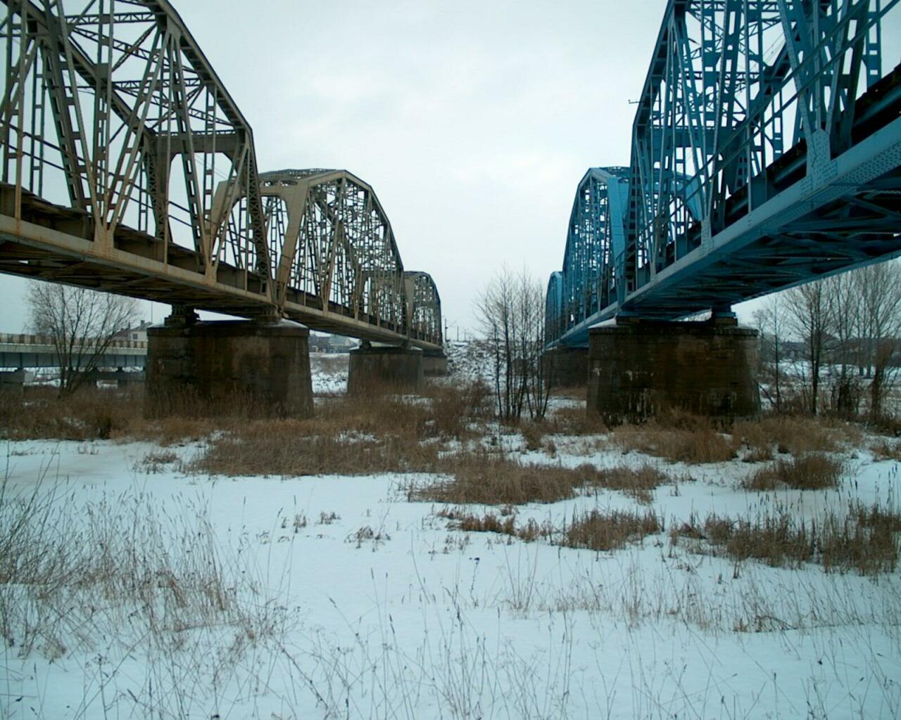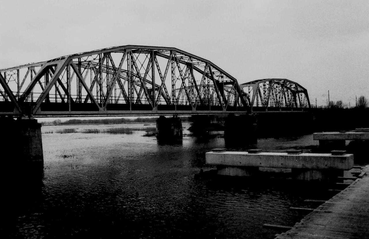 Widok z mostu drogowego na mosty kolejowe nad rzeka Narew. Mosty zelektryfikowane.