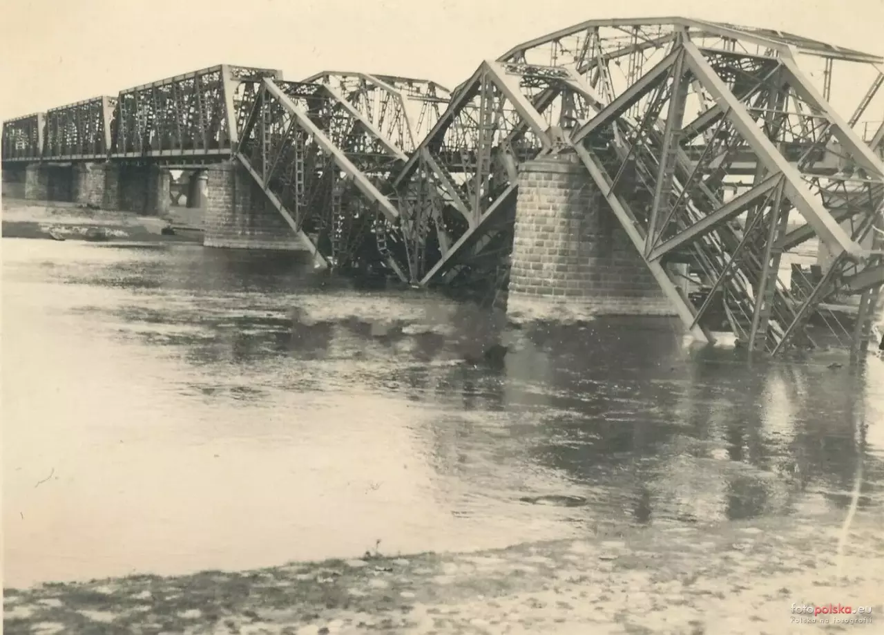 Zniszczone przęsła mostu kolejowego na Bugu koło Małkini - rok 1939.