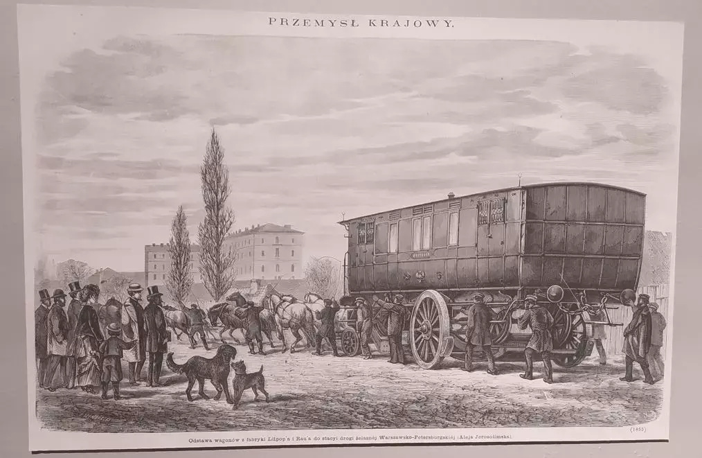 Dostawa wagonów dla Drogi Żelaznej Warszawsko - Petersburskiej na Alei Jerozolimskiej w Warszawie.