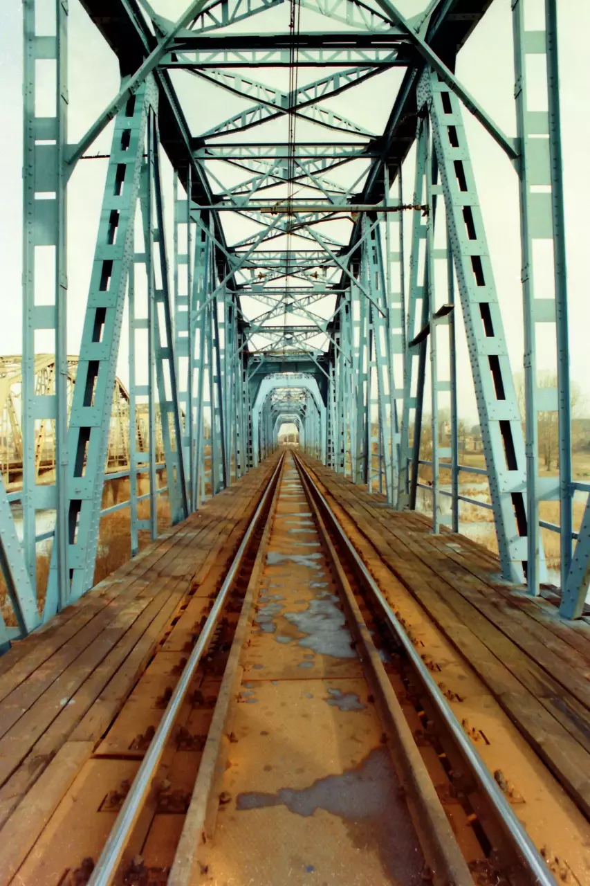 Ciekawostką niekolejową jest widoczna budowa trzeciego mostu drogowego w tym miejscu (oddany w 1995), a całość fotografowana z drewnianego mostu drugiego (z 1956).