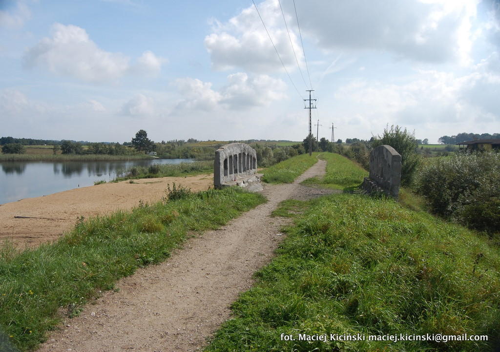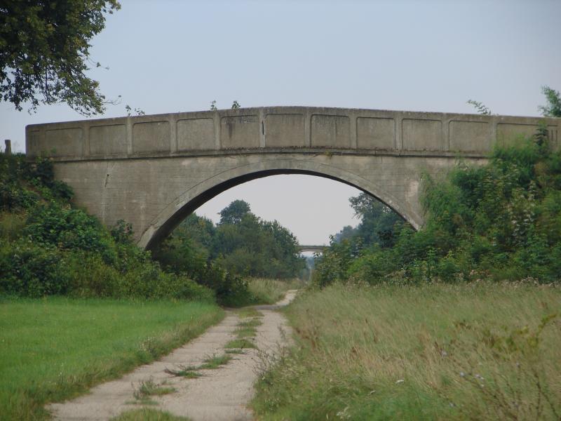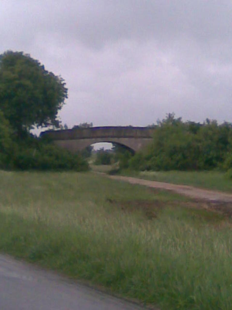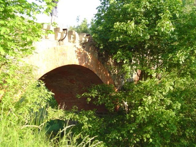 Wiadukt na drodze Dąbrówno-Uzdowo nad dawną linią kolejową. Obecnie przebieg drogi nieco zmodyfikowano aby usunąć konieczność przejazdu przez wąski i w nie najlepszym stanie wiadukt.