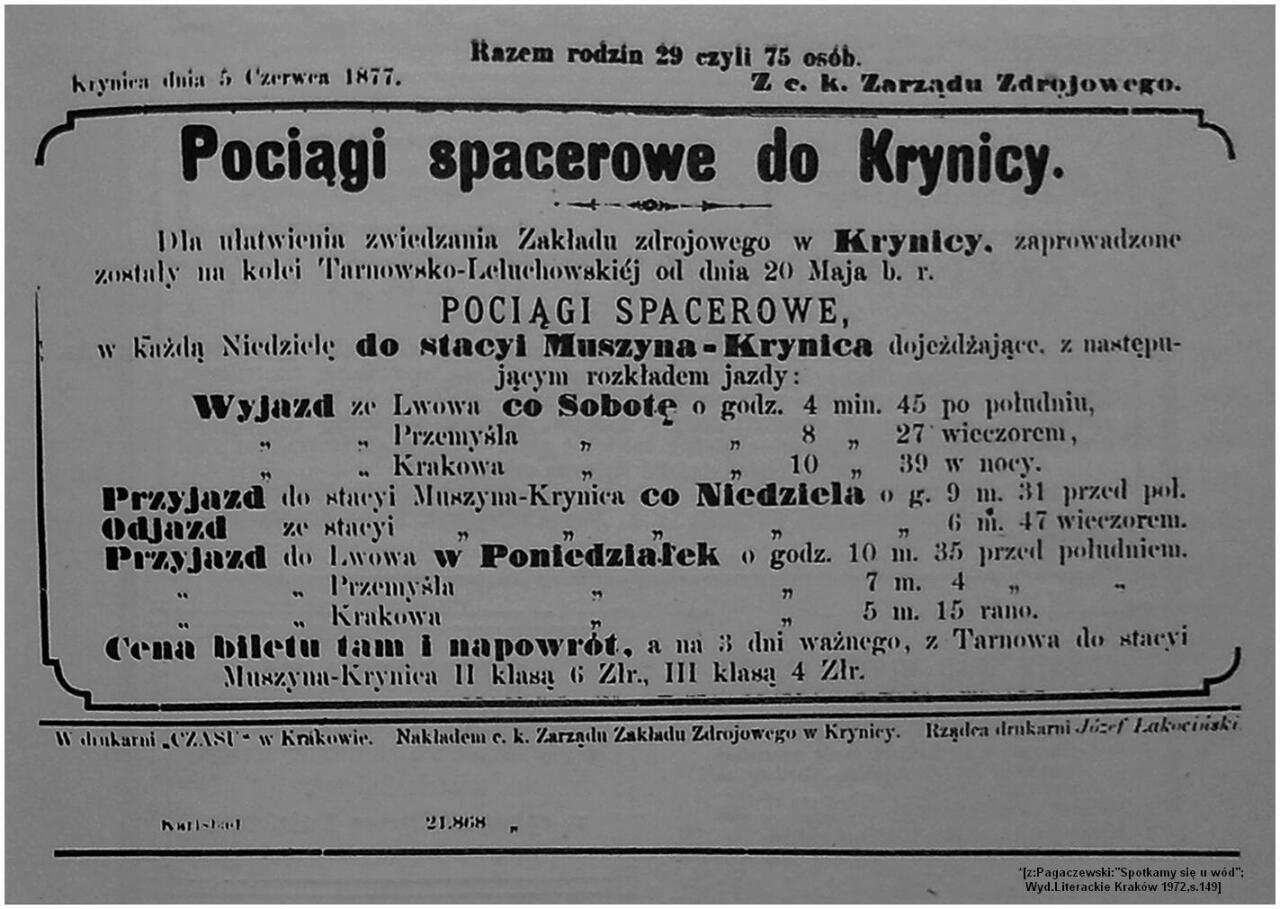 Pociągi spacerowe z Lwowa do krynickich Zdrojów - rozkład jazdy od 20 maja 1877 r. z 5.06.1877 roku, nakładem c.k. Zarządu Zakładu Zdrojowego w Krynicy w 21.868 egz.