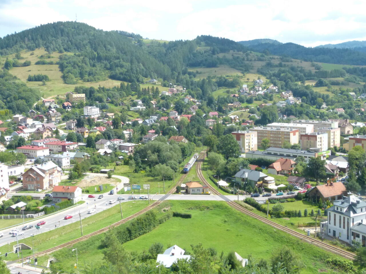 Widok w kierunku Krynicy. W tle przejazd przez ul. Lipową, a u góry ruiny zamku.