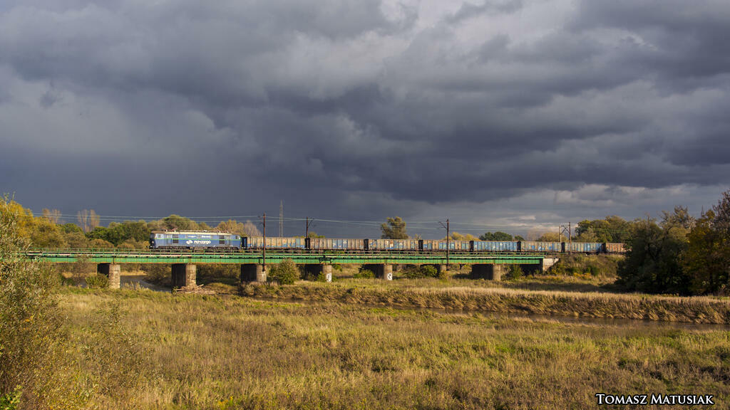 ET22-1013 ze składem węglarek mija most na Wiśle będący punktem granicznym województw małopolskiego i ślaśkiego.