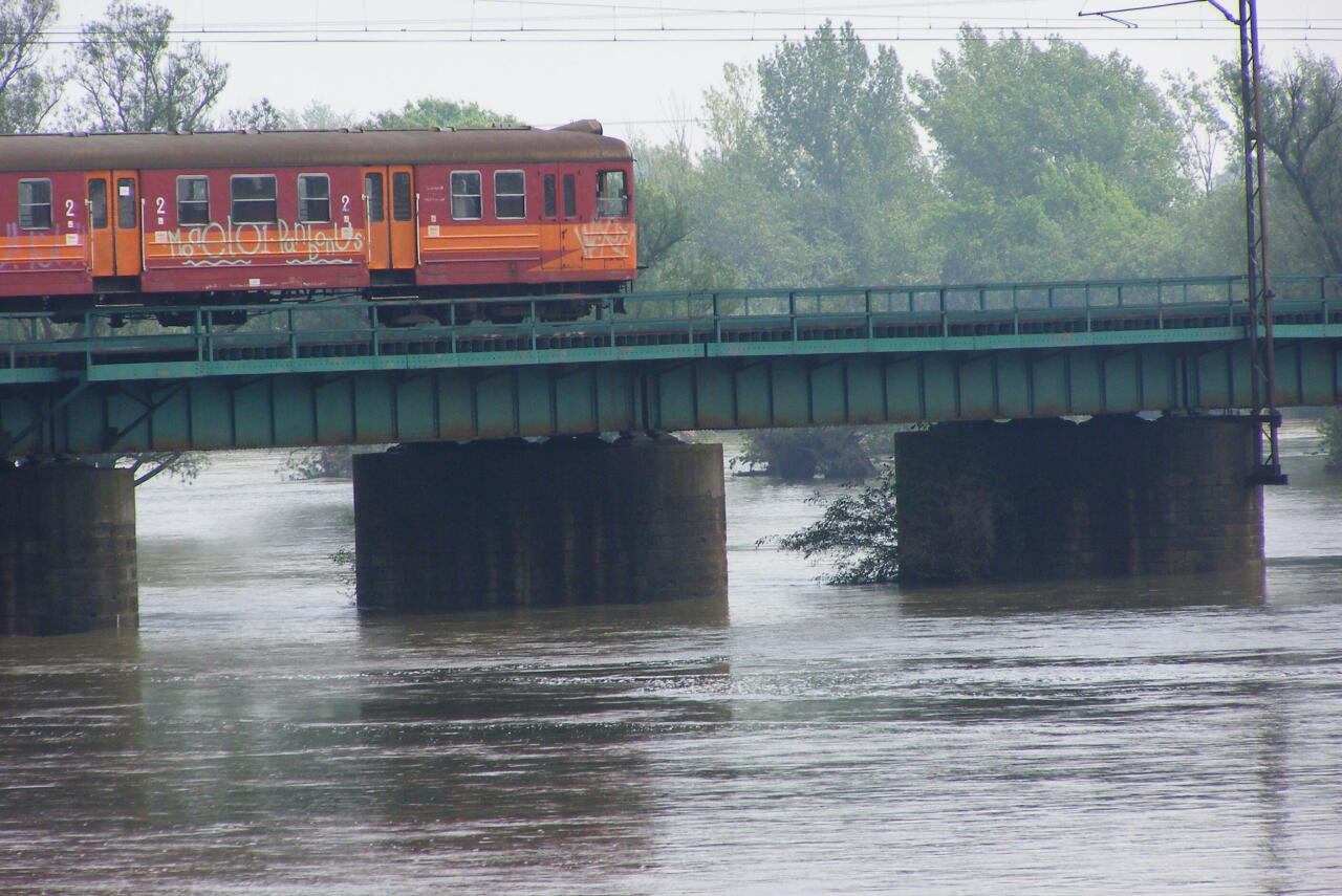 Most na Wiśle na granicy Bierunia i Oświęcimia w 2010tym roku w czasie powodzi. Skład zmierza w kierunku Oświęcimia (w prawo). Zdjęcie zrobione z wjazdu na zalany most drogowy na DK44 w kierunku Oświęcimia.