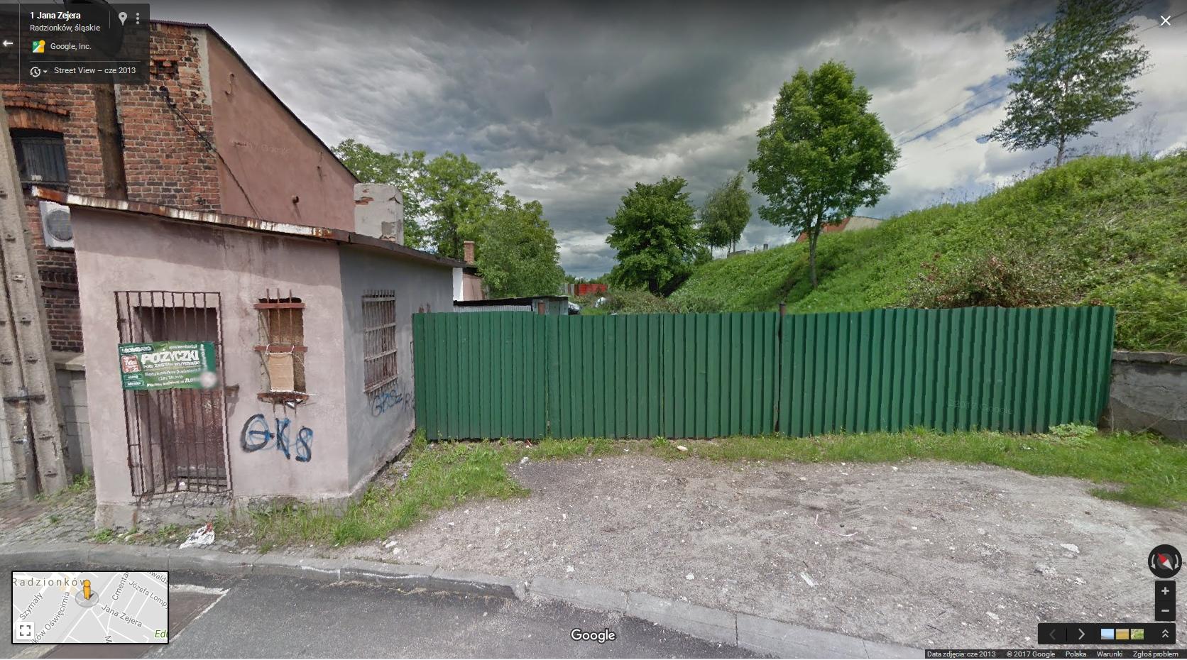 Po lewej strażnica przejazdowa obsługująca dwa tory, tor linii 145 oraz tor wąski. Tory biegły tutaj na wprost a po prawej widać nasyp węglówki. Została wyburzona około lata 2017r.