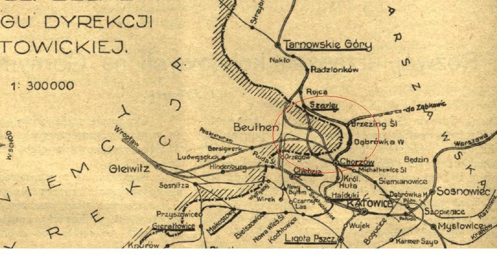 Fragment mapy. Okręgu dyrekcji Katowickiej z 1930 roku ze schematem przebiegu linii Chorzów - Szarlej. Źródło miesięcznik Inżynier Kolejowy nr 4 z 1930 roku.