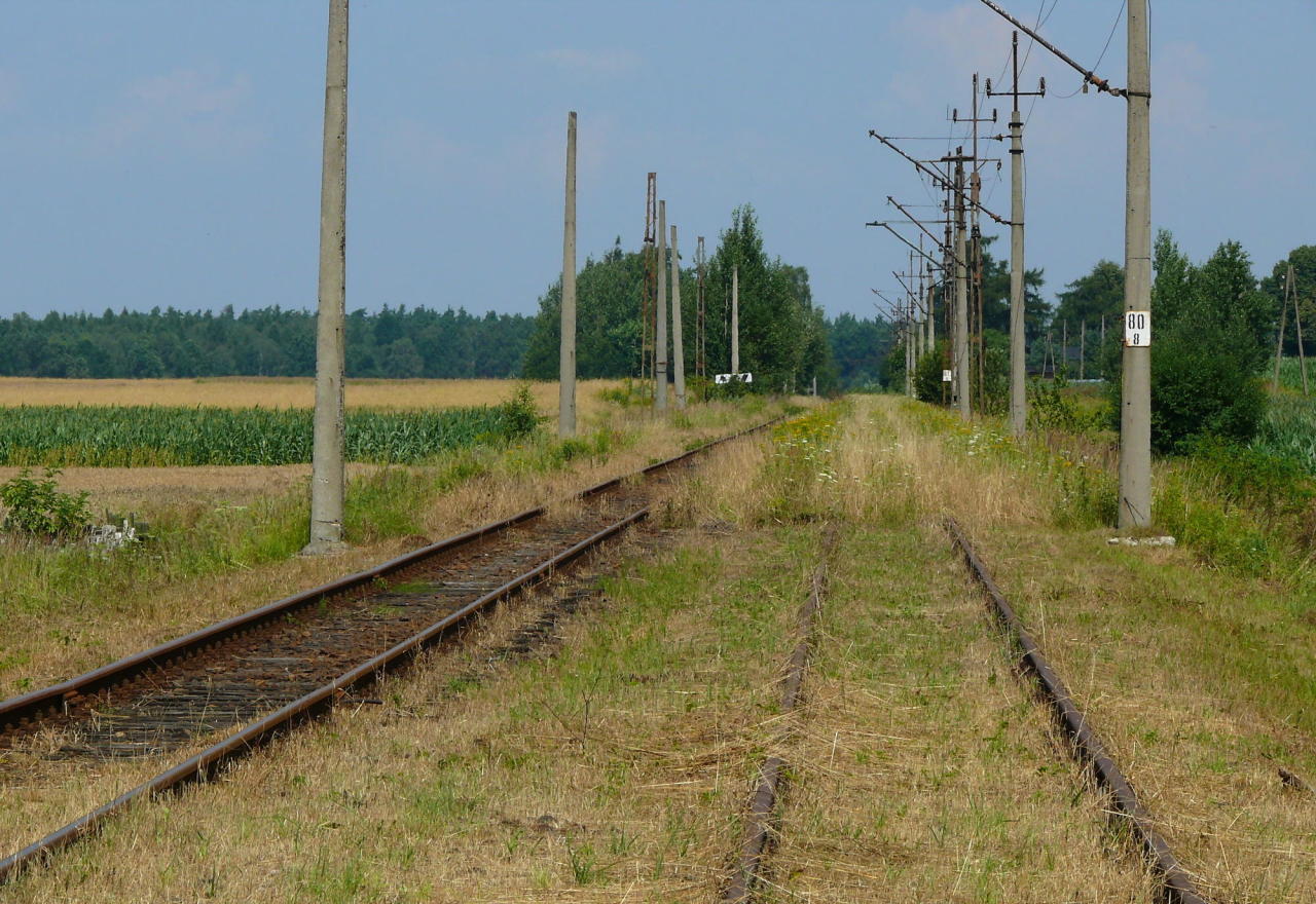 Tarcza ostrzegawcza stacji Fosowskie, w okolicy tarczy kończy się odcinek z zachowaną siecią trakcyjną.