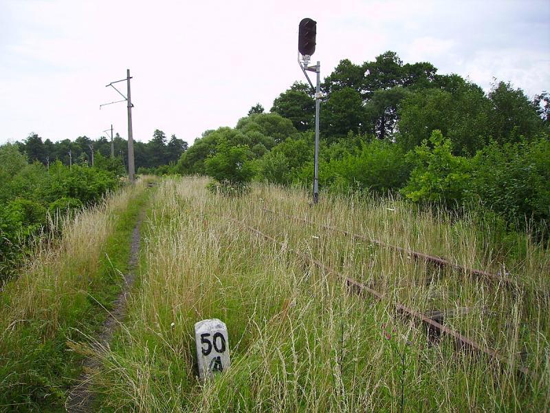 50 km, widoczna tarcza ostrzegawcza przed stacją Fosowskie.