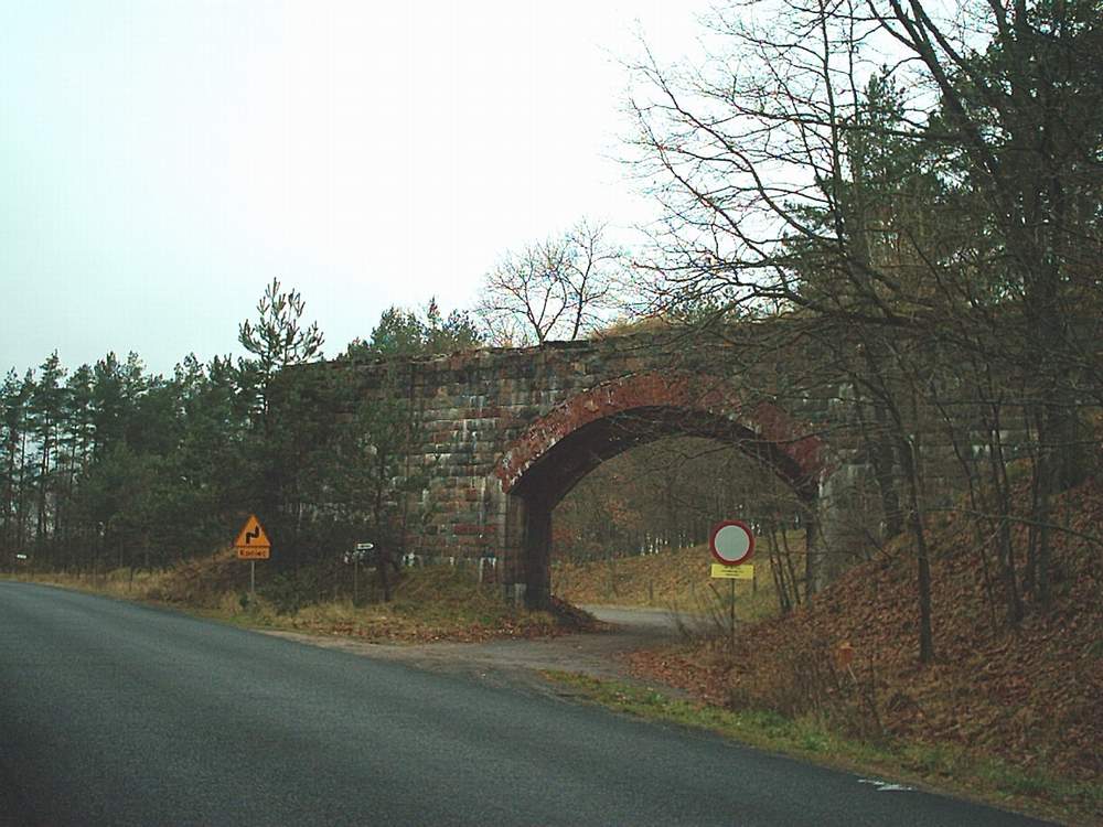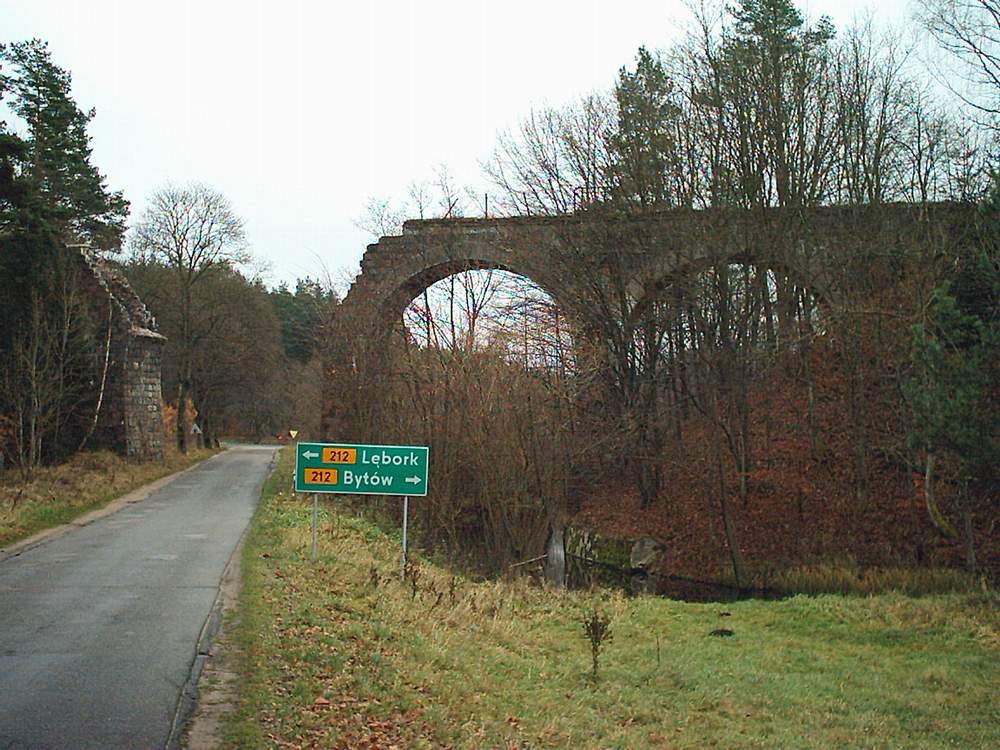 Wiadukt nad linią w kierunku Lęborka ok. 200 m za dawną stacją Pomysk.