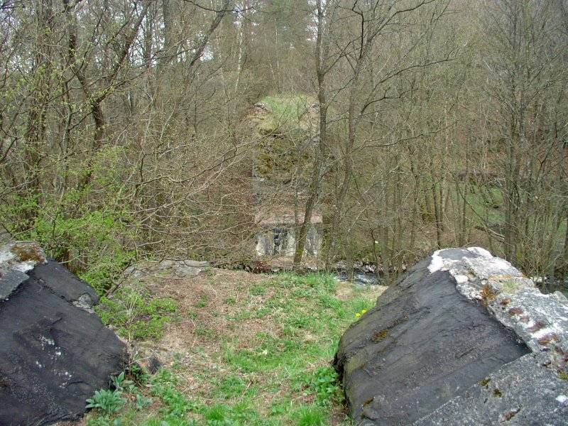 Widok na ruiny mostu kolejowego nad rzeką Słupia w kierunku Bytowa z jednego z przyczółków.