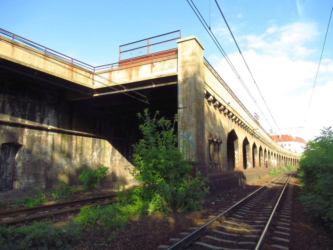 Głogowskie arkady. Wjazd od strony Rudnej/Wrocławia. Cały ruch odbywa się obecnie torem nr 2 (z prawej). Tor pod arkadami jest zamknięty. Widok w kierunku północno-zachodnim (stacja Głogów).