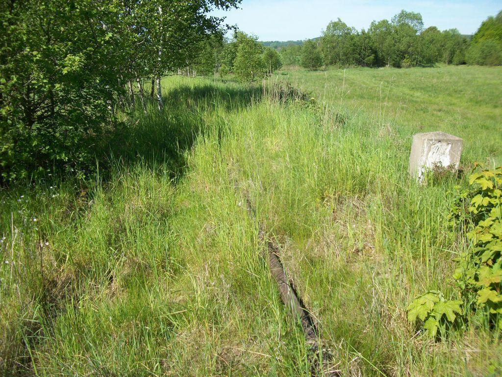 Torowisko plus słupek hektometryczny 77.6 tuż za przystankiem Brzeziniec w kierunku Mirska.