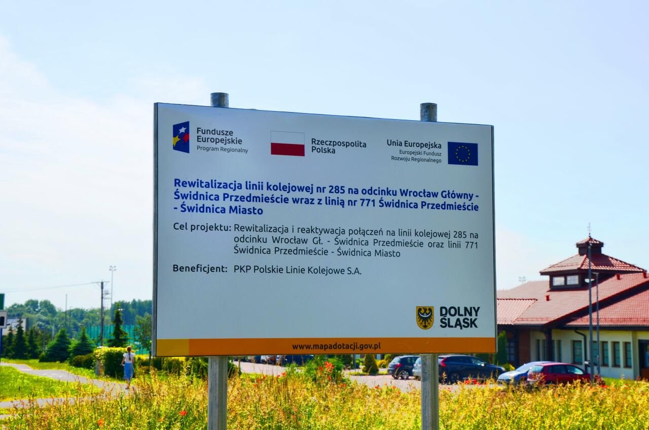 Tablica informacyjna o rewitalizacji linii kolejowej. Została postawiona przy przejeździe kolejowym w Bielanach Wrocławskich, przy ul. Przystankowej.