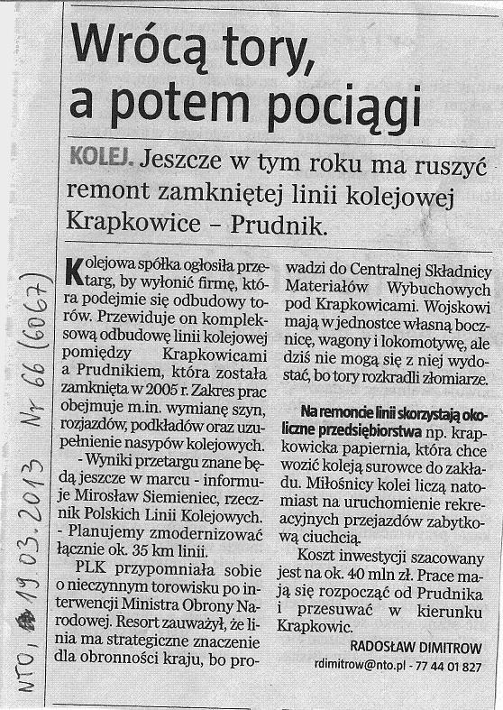Remont linii. Ministerstwo Obrony Narodowej obiecało wyremontować tę linię, nieczynną od 2005 roku! Nareszcie jakieś postępy od strony polskiego rządu. artykuł z opolskiego dziennika NTO (Nowa Trybuna Opolska) z dn. 22.08.2011 (poniedziałek) o lini kolejowej Prudnik - Krapkowice, Nr:194(5587).