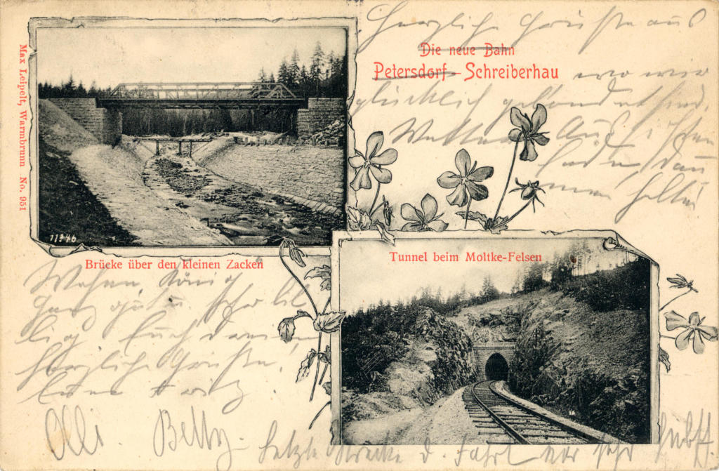W 1899 rozpoczęto budowę na odcinku z Tanvaldu do Kořenova,na którym - prócz kilku tuneli i mostów - na dwóch najbardziej stromych odcinkach trasy o nachyleniu sięgającym 58‰ zastosowano mechanizm kolei zębatej - podwójną listwę zębatą systemu Abta. Łączna długość obu odcinków wynosi 4744 metrów. Połączenie Tanvaldu z Kořenovem oddano do eksploatacji 30 czerwca 1902, 1 października tego samego roku połączono obie sieci - austro-węgierską i pruską - mostem kolejowym na Izerze.