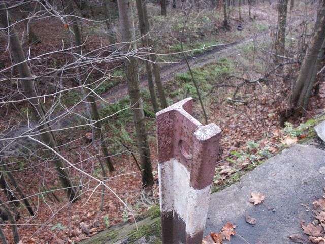 Przejrzałam sporo publikacji dot. tej kolei, autorzy wytropili różności, a to jest widoczne gołym okiem, pod warunkiem, że wraca się piechotą do auta. Nikt tego nie zauważył. Kawałki szyn kolejowych tworzyły barierkę przy drodze. Widoczny napis Koenigshuette 1901. Widać je, podobnie pomalowane, na kilku starych zdjęciach.