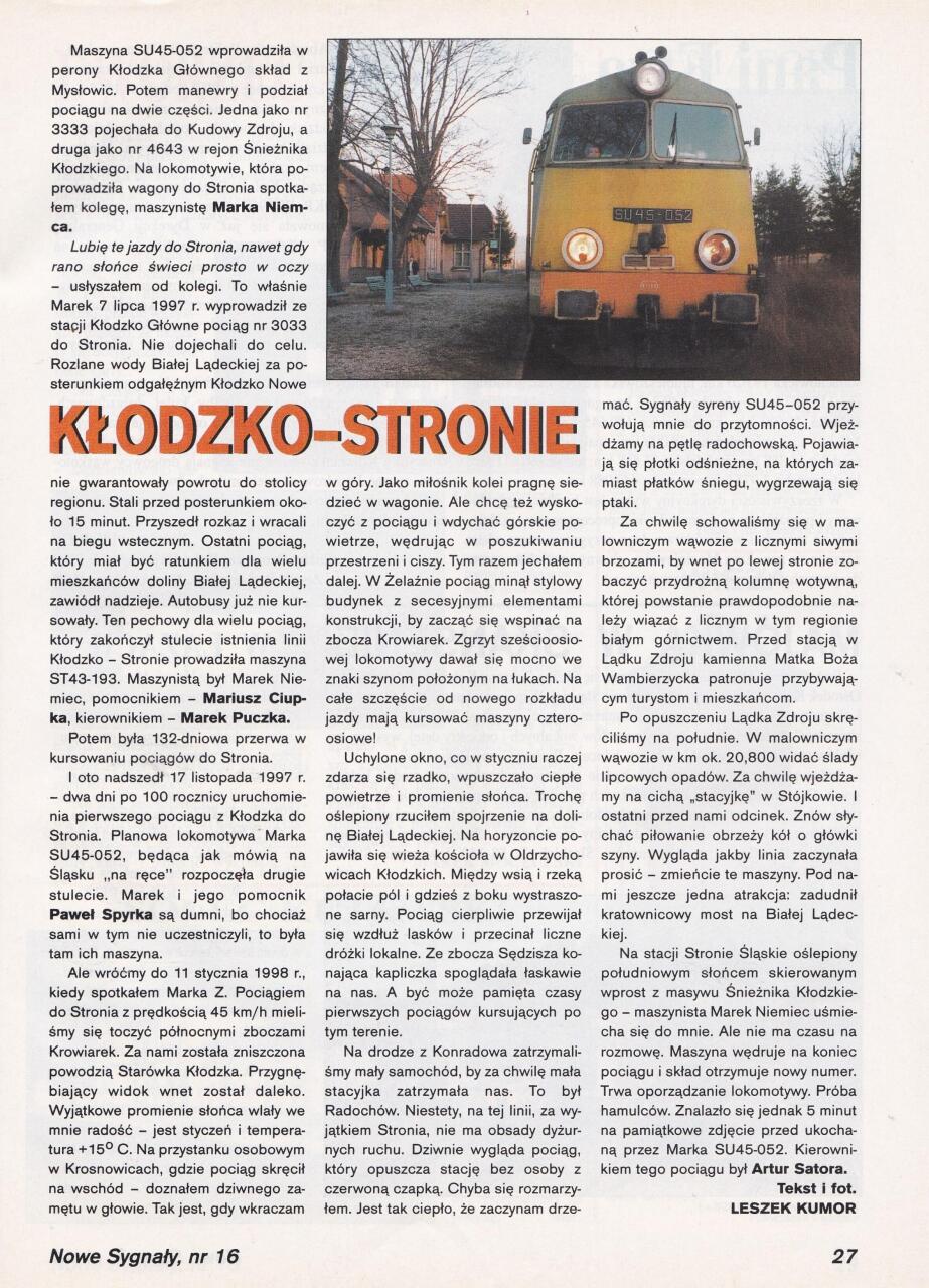 Musieliśmy jechać tym samym składem. Mi taka historia zdarzyła się kilkukrotnie, zawsze z SP32. To nawet nie tyle awaria, co tym pojazdom zwyczajnie brakowało mocy na dłuższe składy na górskich trasach. Do wyboru były jeszcze kamienieckie SU45, te nie miały problemu z pociągnięciem składu ale za to sześcioosiowymi wózkami haratały torowisko na ciasnych łukach, przy okazji swoje obręcze też (ciasne łuki koło Lądka). Trakcyjnicy twierdzili, że najwdzięczniejsze były tu poczciwe Tekatki, ale po zakończeniu przez nie służby nie było ich czym zastąpić.