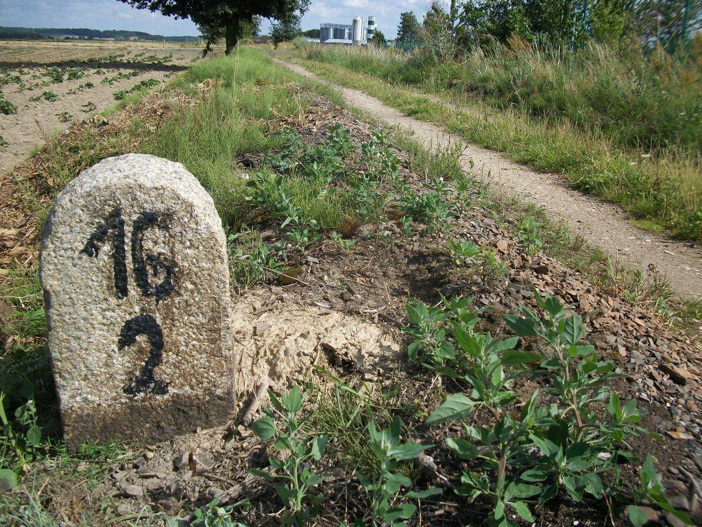 Głęboko zakopany słupek hektometryczny 16.8 przy ścieżce rowerowej biegnącej dawnym torowiskiem w Warcie Bolesławieckiej - widok w stronę Nowej Wsi Grodziskiej.