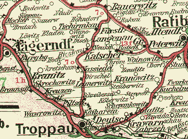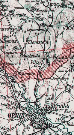 Mapa przedstawiająca linię Baborów - Opava Zapad, jeszcze w granicach Niemiec.