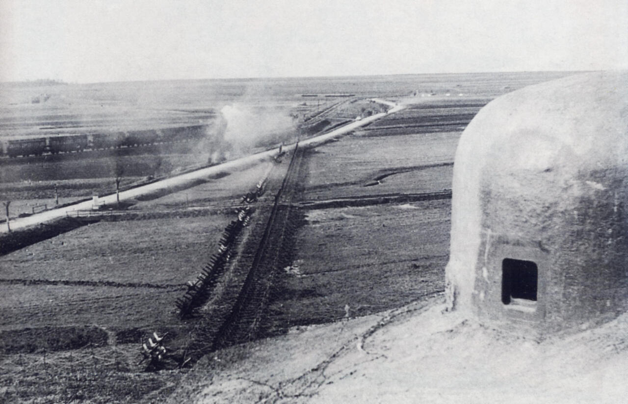 Widok z bunkra na przejeżdżający skład relacji Opava-Baborów.