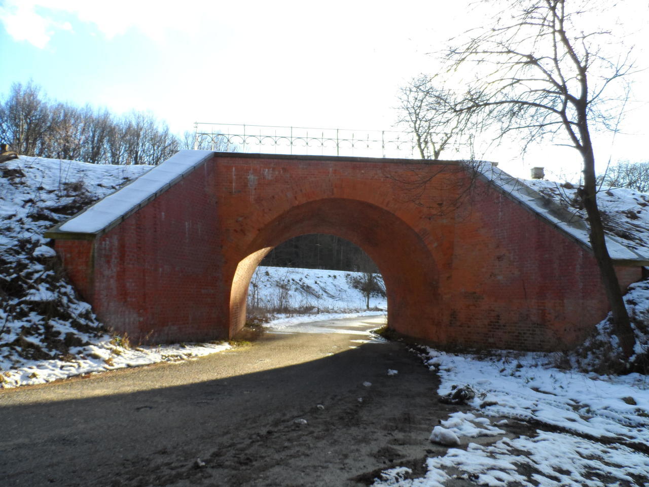 Przepust tuż za (przed) stacją w Szydłowie. W świetle przepustu widoczna na nasypie linia kolejowa Opole Zachodnie - Nysa.
