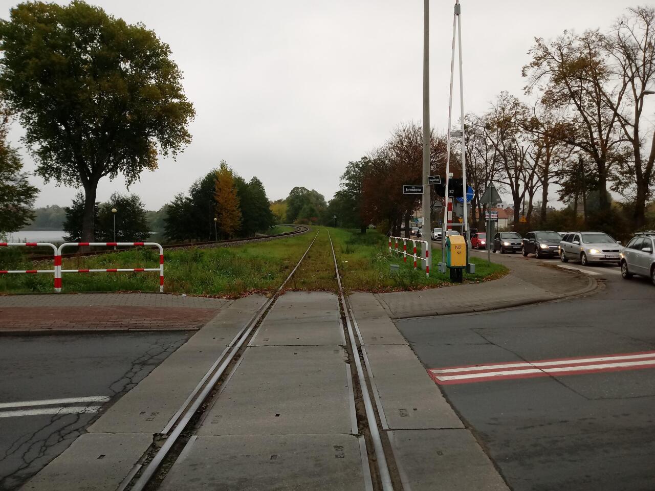 Przejazd kolejowy w Wągrowcu (ul. Bartodziejska) - widok w kierunku stacji Wągrowiec.