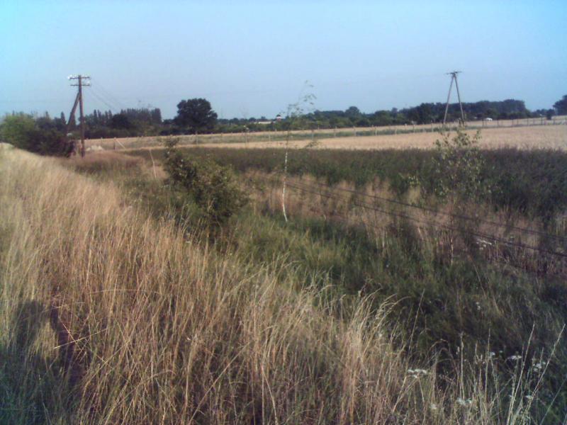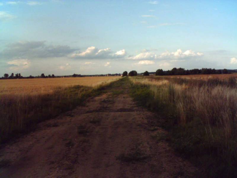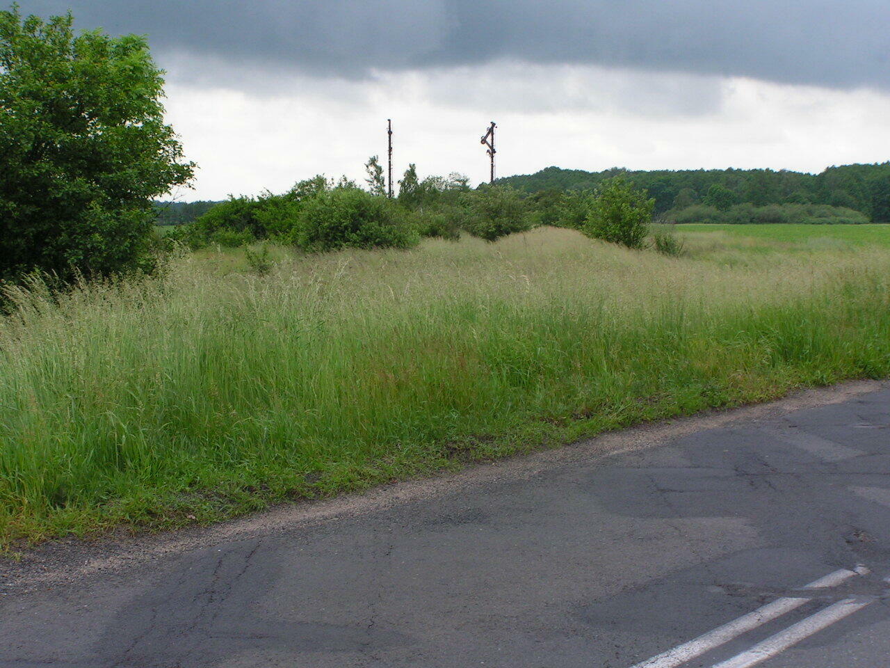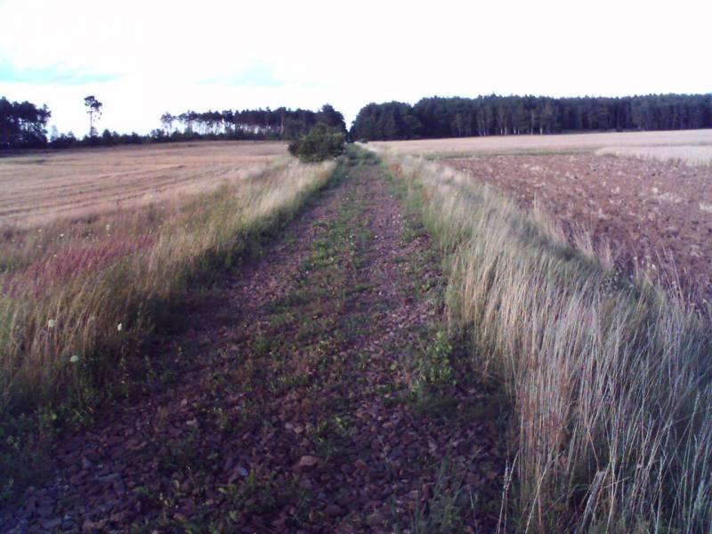 Widok w kierunku Krzelowa. Te zabudowania w oddali to już Krzelów, dawna stacja węzłowa w kierunkach na Ścinawę, Wąsosz (Rawicz) i Górę (Leszno).