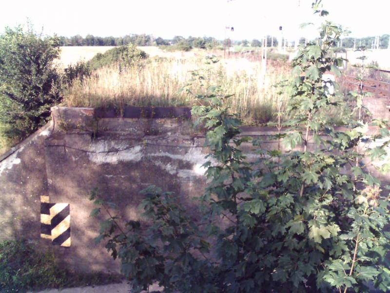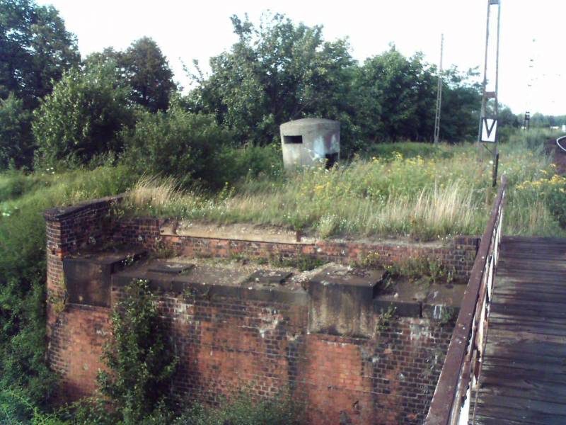 Wschodni przyczółek wysadzonego w 1945 trzeciego przęsła mostu kolejowego na Odrze na linii legnicko-rawickiej.