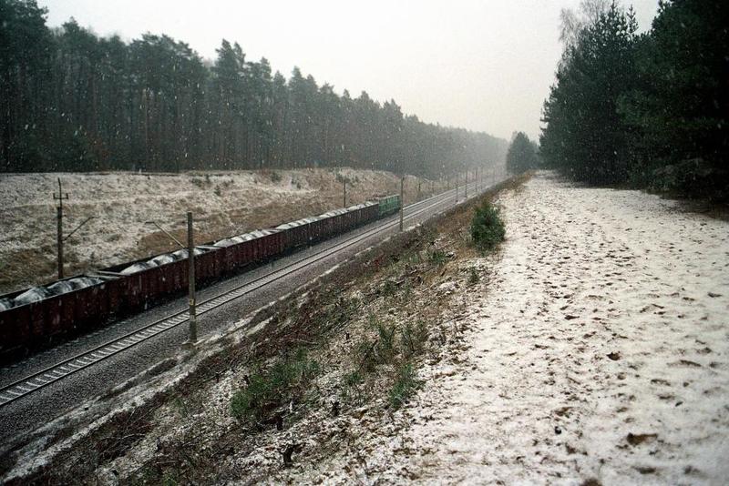 Widok w kierunku Warnowa, lecz ciężki pociąg towarowy jedzie w kierunku Świnoujścia. Z uwagi na duże wzniesienia na tym odcinku, na stacji Warnowo, w końcu składu podłączono lokomotywę popychającą (widoczną na zdjęciu).