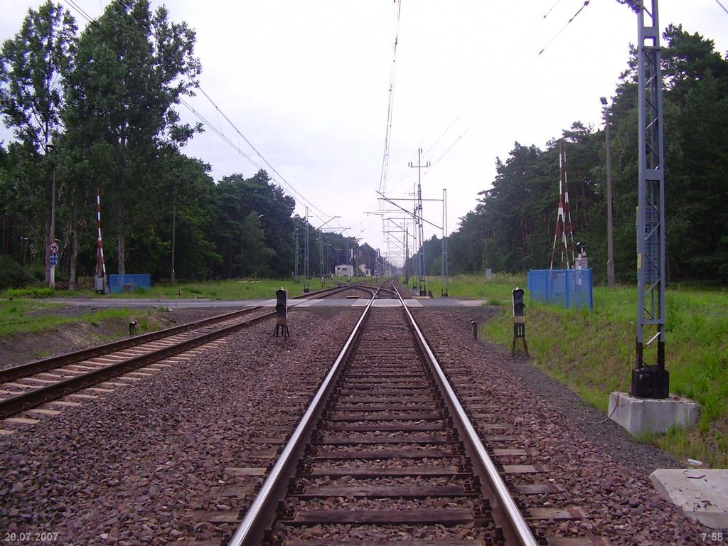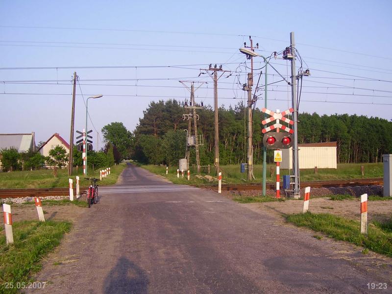 Niestrzeżony przejazd kolejowy na linii 401. W lewo Świnoujście, a w prawo Szczecin.