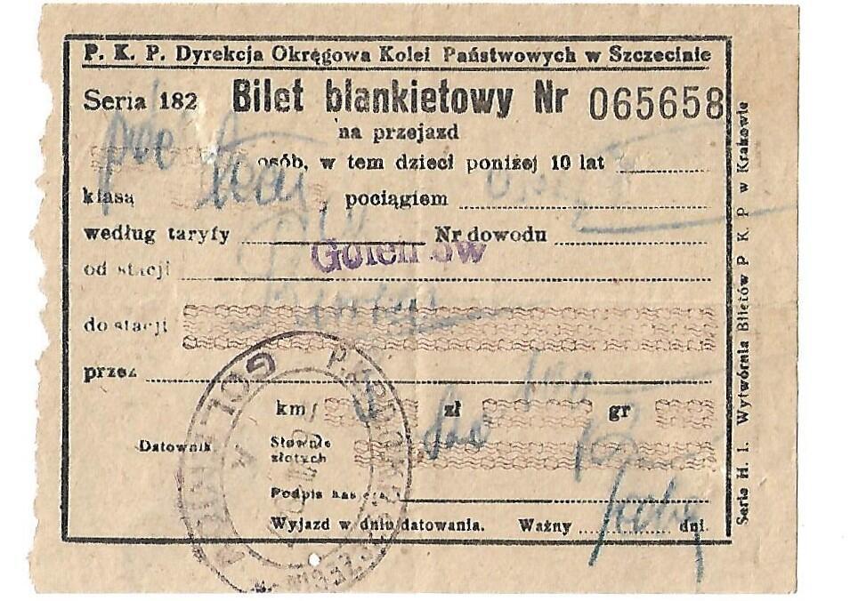 Bilet kolejowy (1947 rok) Goleniów - Rurka.