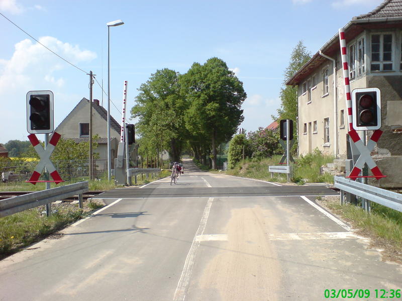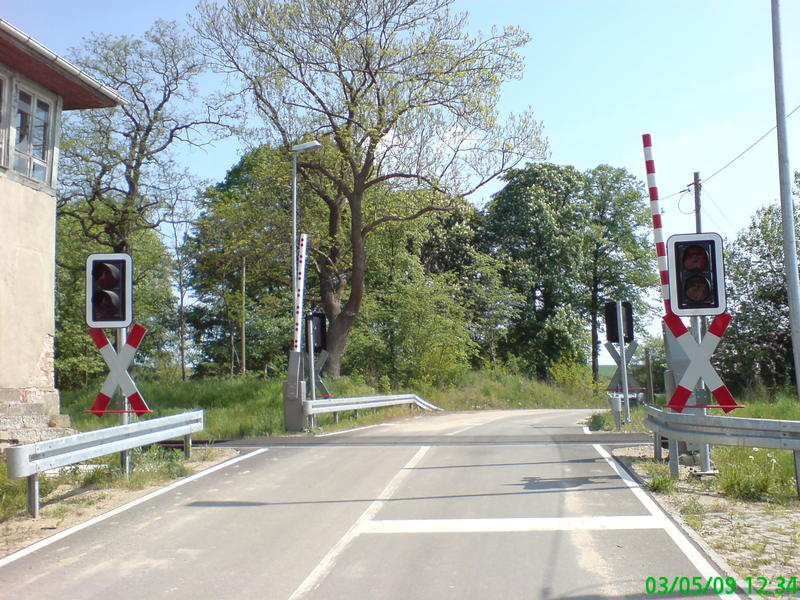 Tantow Vorwerk - przejazd kolejowy z automatycznymi półzaporami od strony wsi.