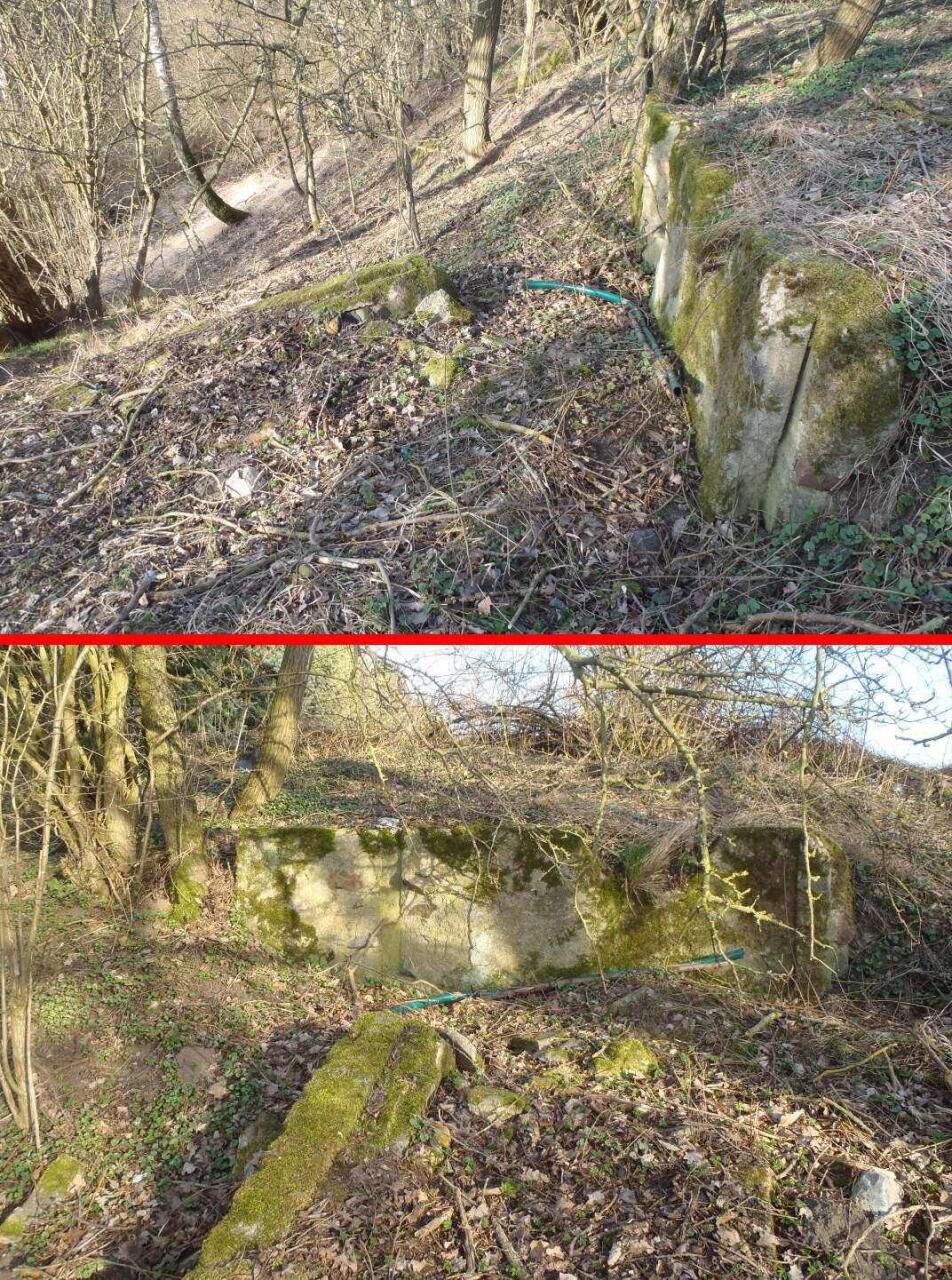 Przyczółki dawnego wiaduktu nad torami przebiegającymi w głębokim wąwozie - była to droga brukowana ze Smętowic do Smolęcina.