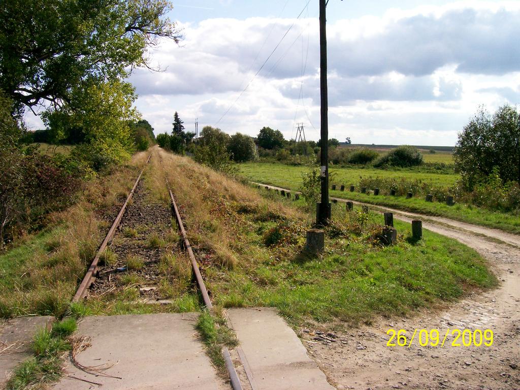 Widok z przejazdu kolejowego w miejscowości Kozin, kierunek Myślibórz. Od razu widać, że linia od dawna nie jest już uczęszczana w porównaniu do przeciwnego kierunku na tym przejeździe.