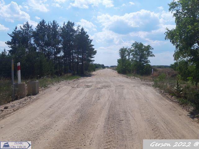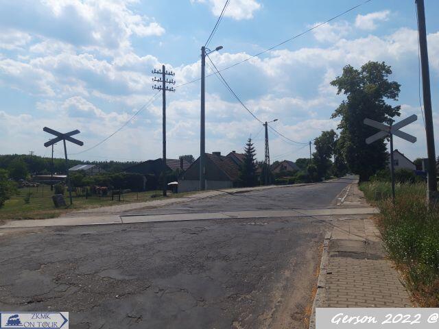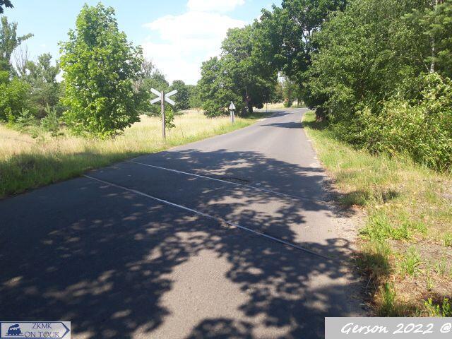 Widok z przejazdu kolejowego znajdującego się w Zwierzynie na drodze łączącej DW156 z ulicą Sportową (współrzędne: 52°50'23.1"N 15°33'56.3"E) w kierunku Strzelec Krajeńskich. DW156 znajduje się poza kadrem, po prawej stronie.
