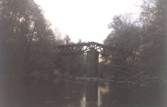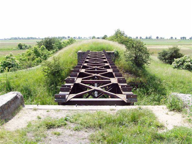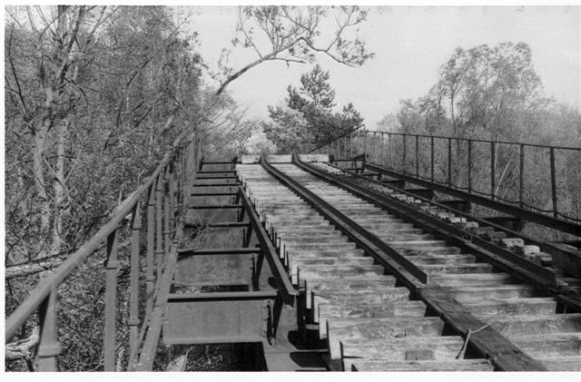 Zniszczony most kolejowy nad Gwdą w Płytnicy, na linii Wałcz - Złotów. Widok w kierunku północnym; w prawo stacja Płytnica/Wałcz, w lewo Węgierce/Złotów.