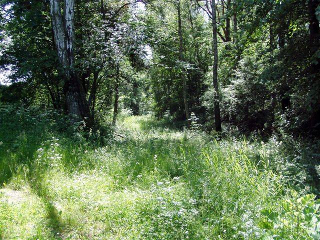 Widok wykopu z czwartego wiaduktu w kierunku Złotowa, na byłej linii do Wałcza. W zaroślach widoczny wiadukt, na którym leży tor ze Złotowa (w lewo) do Piły (w prawo).