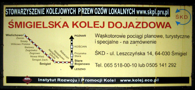Śmigielska wąskotorówka. Schemat trasy ŚKD. Tablica ta znajduje się na stacji Stare Bojanowo Wąskotorowe.
