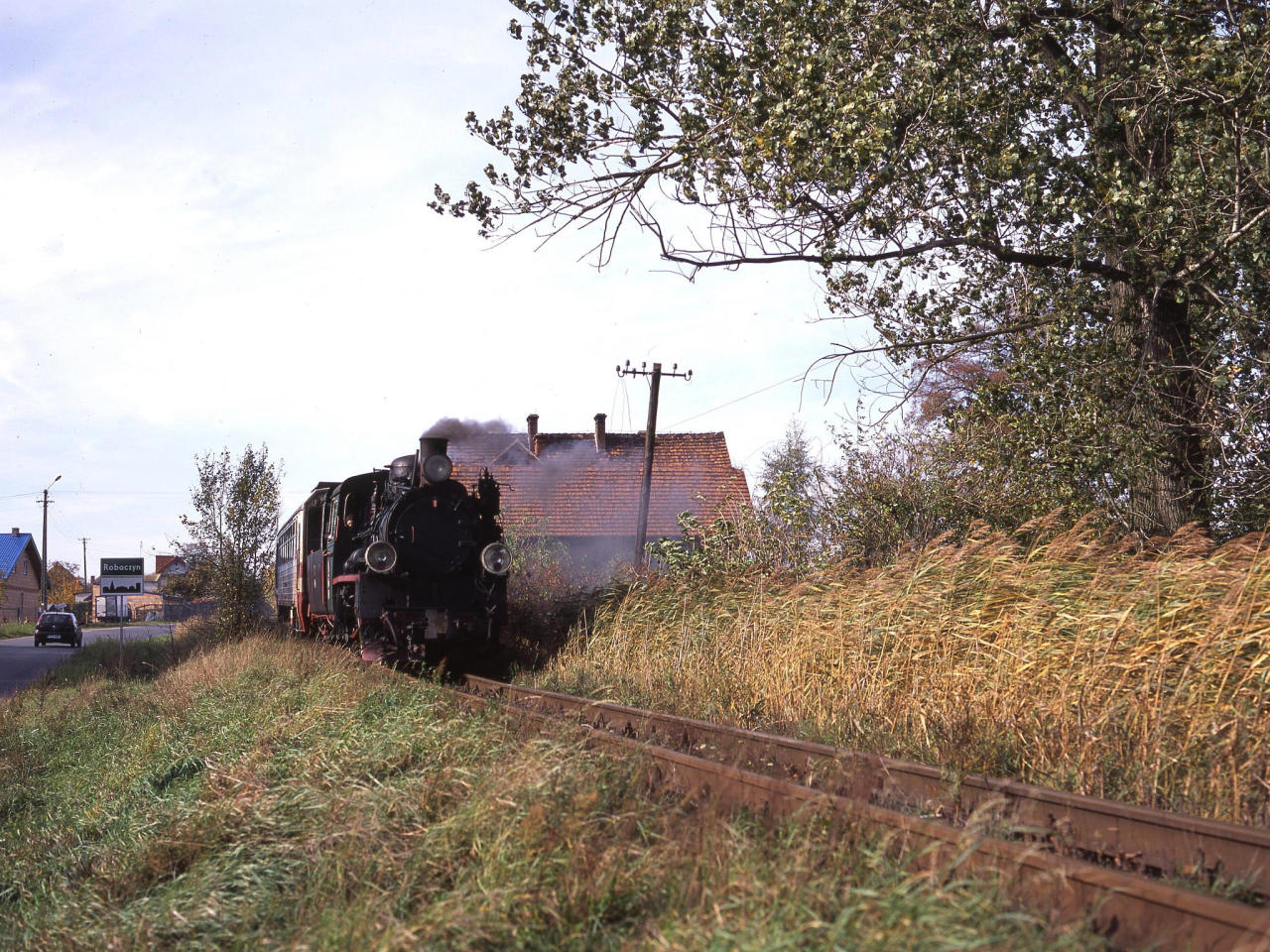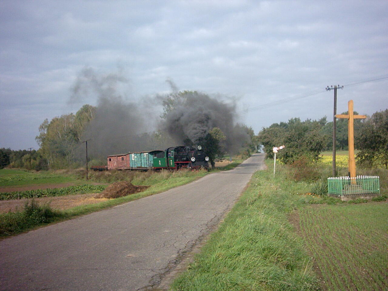 Km ~40,28 linii (Rakoniewice Wąskotorowe) Wielichowo - Zgliniec (Krzywiń), pociąg specjalny z cyklu imprez "NOSTALGIA ZA PARĄ", organizowanych przez Poznański Klub Modelarzy Kolejowych, relacji Zgliniec - Wielichowo, prowadzony lokomotywą Lxd2 opuszcza miejscowość Jezierzyce. Widok w kierunku stacji Zgliniec (Krzywiń).