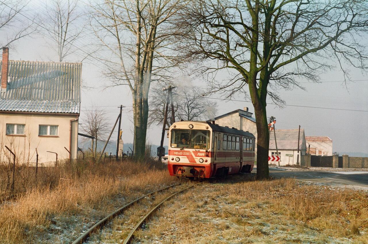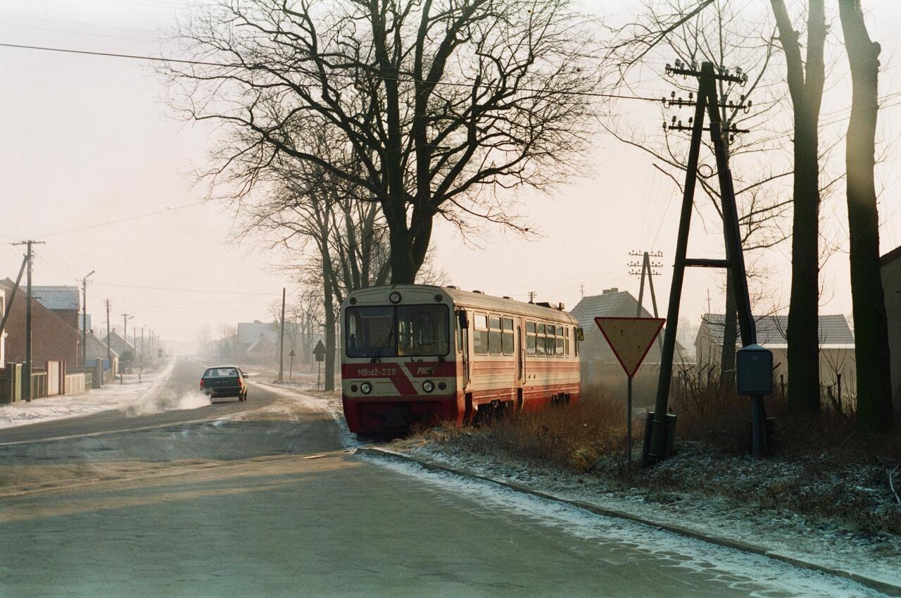 Wagon spalinowy MBxd2-228 na postoju około 100 metrów za przystankiem osobowym, ładownią Śniaty (w kierunku Wielichowa) - na wprost ulica Wielichowska. Widok w kierunku stacji Stare Bojanowo Wąskotorowe (Krzywiń).