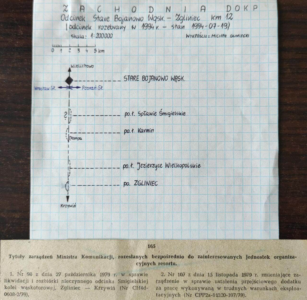 Uproszczony schemat rozebranego odcinka Stare Bojanowo Wąskotorowe - Zgliniec, stan na dzień 19 lipca 1994 roku. Tytuł Zarządzenia Ministra Komunikacji, dotyczący likwidacji i rozbiórki odcinka Zgliniec - Krzywiń.