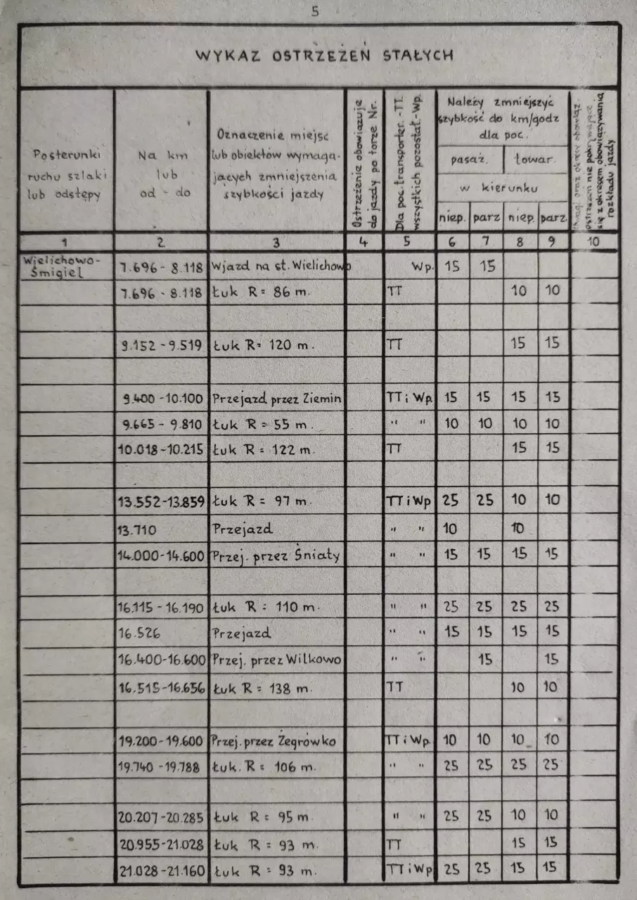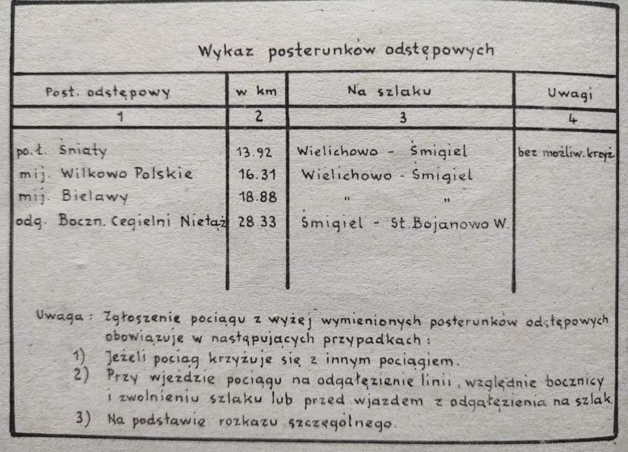Wykaz ostrzeżeń stałych Śmigielskiej Kolei Dojazdowej: odcinek Wielichowo - km 21,160 linii Wielichowo - Stare Bojanowo Wąskotorowe, skan ze służbowego Rozkładu Jazdy Pociągów Pasażerskich i Towarowych - zeszyt VII-W-5 (RJ 1990/1991).