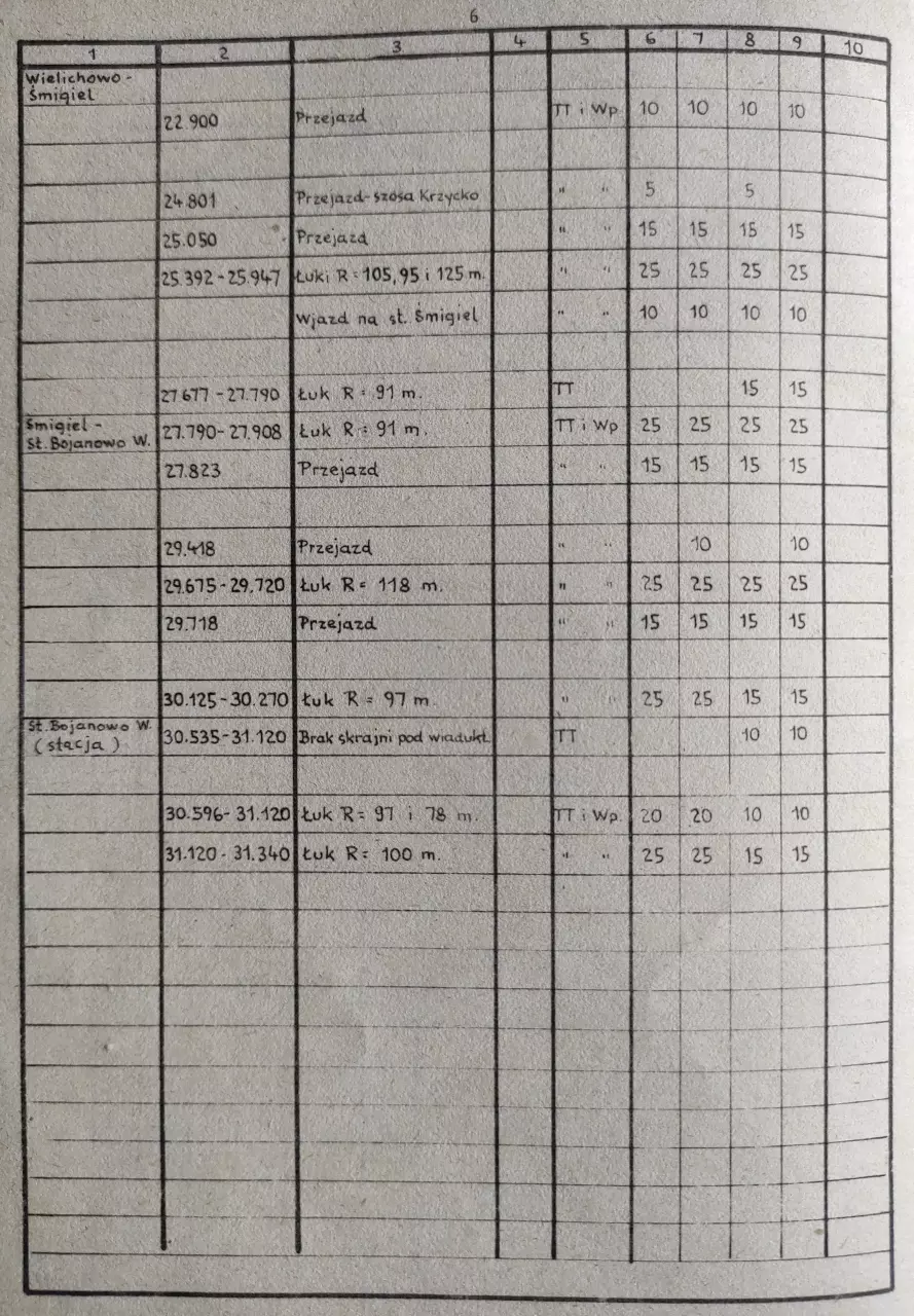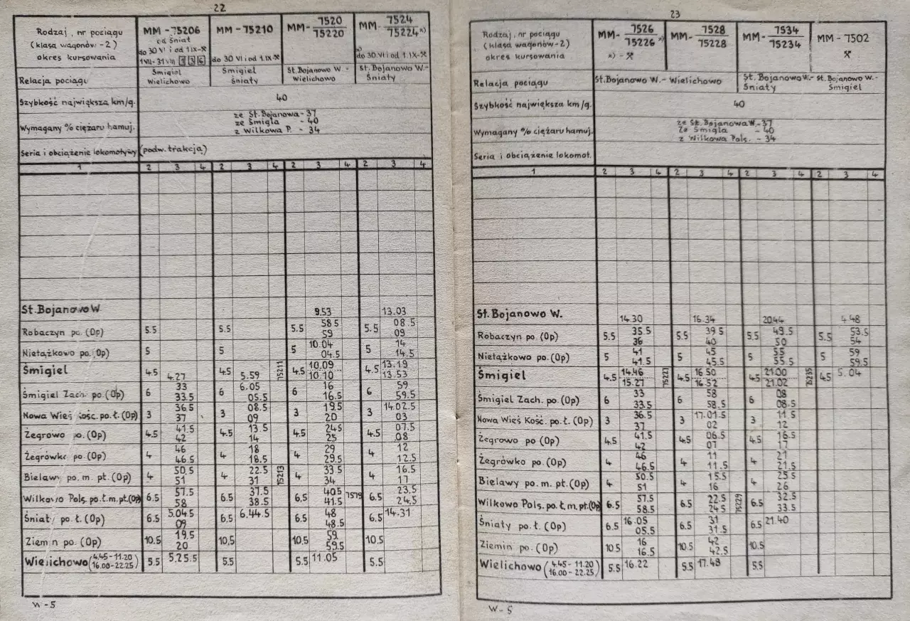 Wykaz ostrzeżeń stałych Śmigielskiej Kolei Dojazdowej: odcinek km 22,900 - Stare Bojanowo Wąskotorowe linii Wielichowo - Stare Bojanowo Wąskotorowe, skan ze służbowego Rozkładu Jazdy Pociągów Pasażerskich i Towarowych - zeszyt VII-W-5 (RJ 1990/1991).