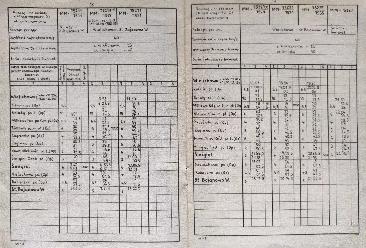 Pociągi pasażerskie na linii Wielichowo - Stare Bojanowo Wąskotorowe, skan ze Służbowego Rozkładu Jazdy Pociągów Pasażerskich i Towarowych - zeszyt VII-W-5, strony 18-19 (RJ 1990/1991).