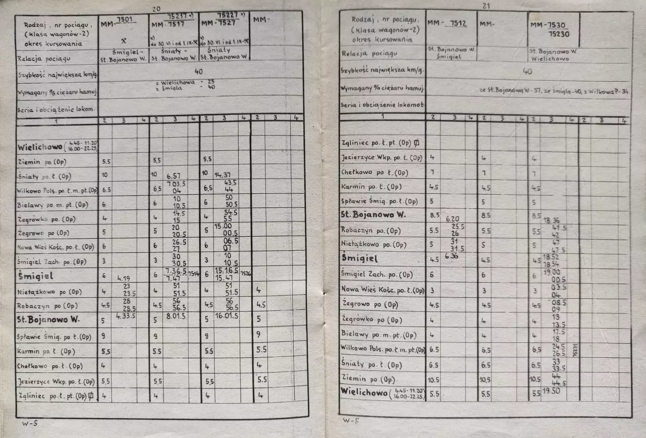 Pociągi pasażerskie na linii Wielichowo - Stare Bojanowo Wąskotorowe, skan ze Służbowego Rozkładu Jazdy Pociągów Pasażerskich i Towarowych - zeszyt VII-W-5, strony 20-21 (RJ 1990/1991).